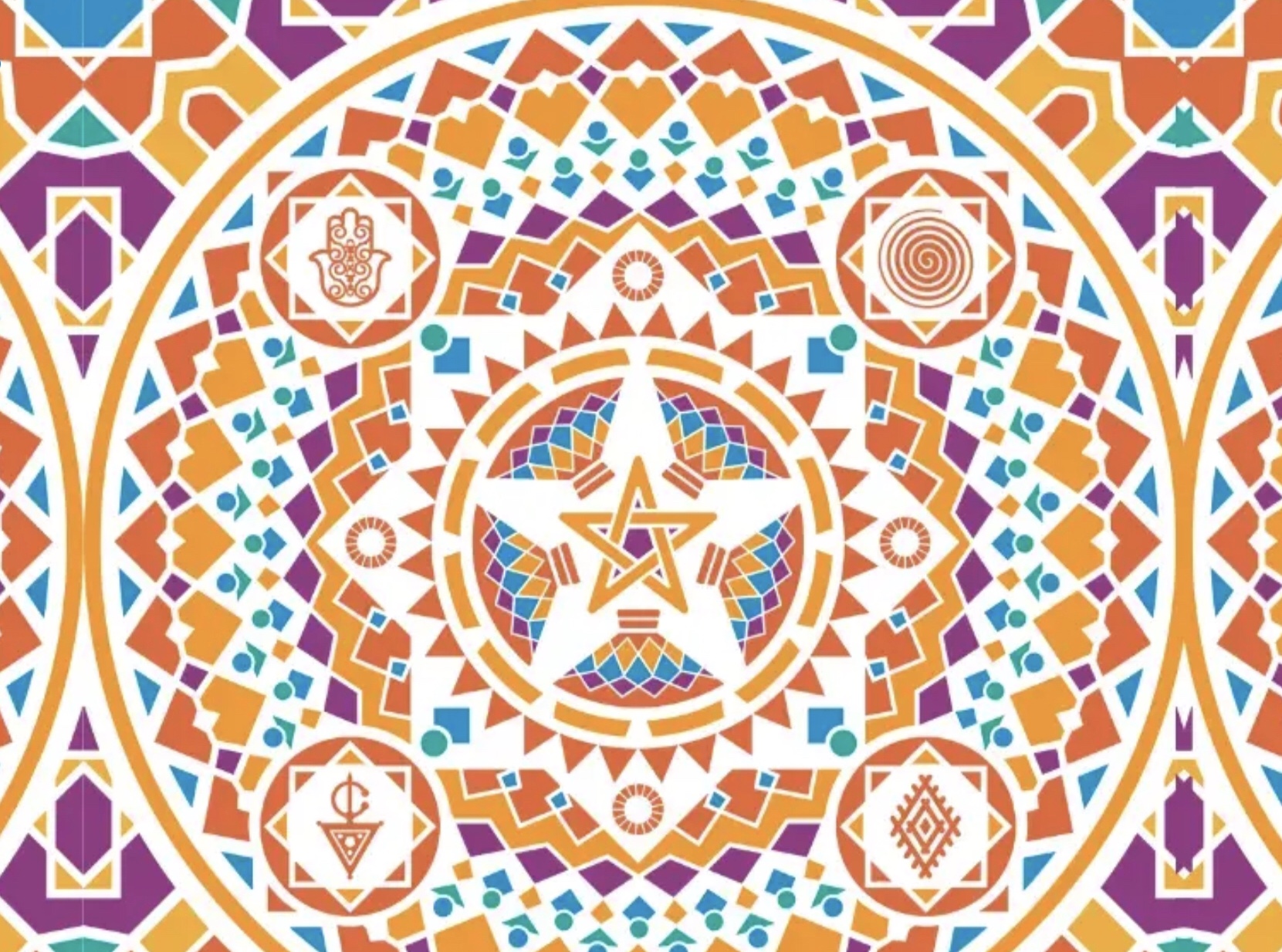 Les symboles reflètent les piliers et enrichissent la mosaïque : La Khmisa est le symbole choisi pour la protection et la dignité des femmes et des filles. La spirale ou le cosmos est le symbole choisi pour l’autonomisation des jeunes.La fibule est le symbole choisi pour la fertilité, la santé sexuelle et reproductive.Le diamant est le symbole choisi pour l’intelligence démographique. L’assiette centrale de couscous relie tous ces éléments, incarnant l’unité, la résilience et les liens familiaux profonds qui font la force du Maroc.