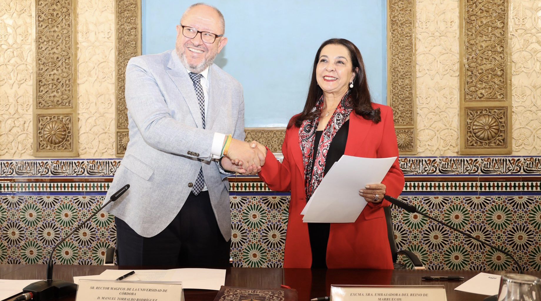 Karima Benyaich,Ambassadrice du Maroc en Espagne et Manuel Torralbo Rodríguez, Recteur de l’Université de Cordoue ont procédé à la signature de l’accord pour la création de la Chaire de Relations Hispano-Marocaines, qui portera le nom de Fatima Al-Fihriya , fondatrice de la plus ancienne Université Al-Qaraouiyine de Fès.
